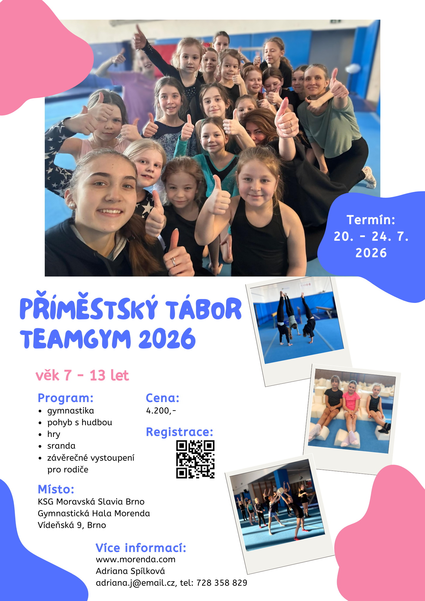 Termín 2: 27. – 31. 7. příměstský tábor je vyhrazen pro děti s gymnastickou nebo TeamGymovou průpravou, přednostně zatím přijímáme členy klubu, máte-li zájem se tohoto termínu zúčastnit, kontaktujte, prosím Adrianu Spílkovou: adriana.j@email.cz, 728 358 829